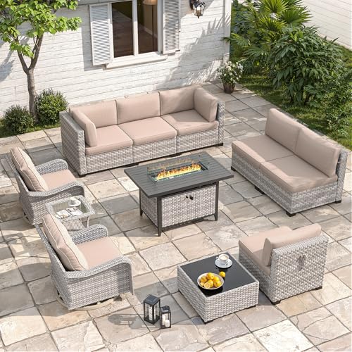 Specification: 8-Seat Outdoor Wicker Patio Furniture Set with Fire Pit Table, Modular Rattan Sectional Sofa & 2 Swivel Rocking Chairs, 4″ Thick Cushions, Rust-Resistant Frame,Beige