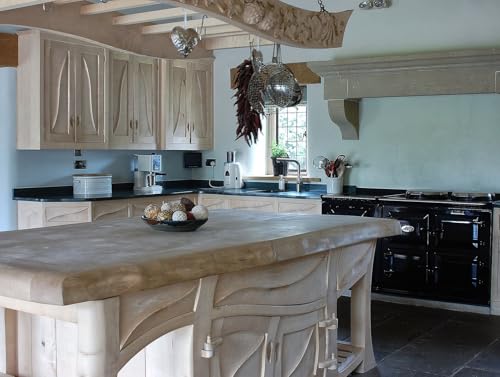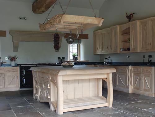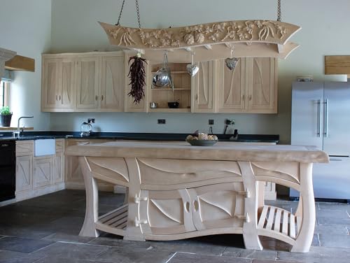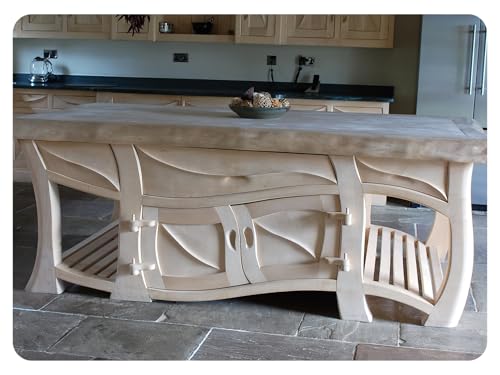 This type of quirky natural form design is made entirely by hand, Made from Figured Sycamore with 100mm thick solid worktop, sculptural drawer fronts and door panels with original wooden hinges.