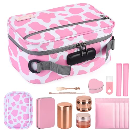Specification: Portable Activated Charcoal Lock Bags Set Travel Case With Carbon Lined Great Festival Gifts For Women, Large Storage Bag With Combination Lock with 11 Small Items Pink and white