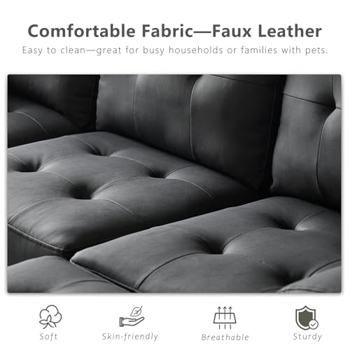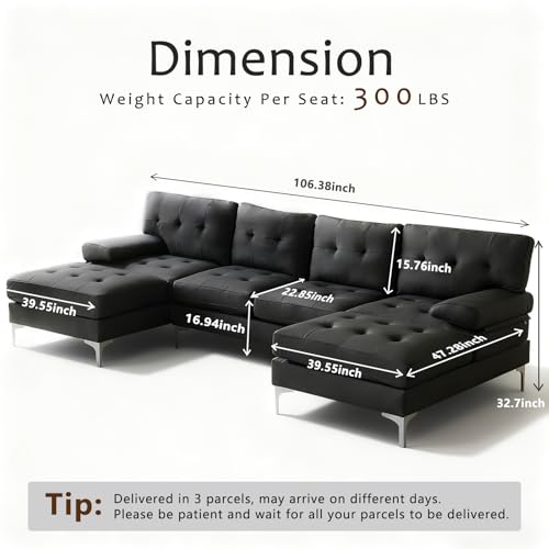 Specification: Wimarsbon 106” U-Shaped Couch with Double Chaise, Modern Upholstered 4-Seat Sectional Sofa Set for Living Room, Bedroom, Apartment, Easy to Assemble (Black-Faux Leather)